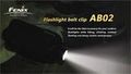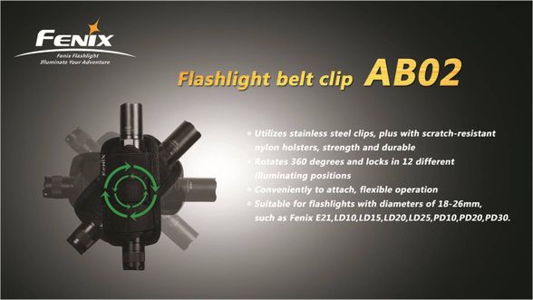 Клипса для фонарей Fenix AB02 используется для крепления фонарей E21, LD10, LD15, LD20, LD25, PD10, PD20, PD30 к ремню на брюках. Поворачивается на 360 градусов и фиксируется в 12 различных позициях. Подходит для фонарей с диаметром 18-26 мм.