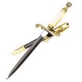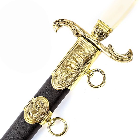 Сувенирный наградной кортик офицеров Тяжелого авианесущего крейсера "Адмирал Кузнецов" Военно-Морского Флота (ВМФ) Российской Федерации - это не только символ славы и гордости российского флота, но и прекрасный предмет, который может быть использован как для составления образа, так и для украшения помещения. Эфес кортика украшен декоративной гардой, которая придает ему особый шарм и элегантность. Латунное навершие в виде герба Российской Федерации добавляет ему национальное значение и символизирует верность и преданность Родине. Обтянутые кожей ножны украшены накладками с символом ВМФ - якорем, который является символом морской мощи и истории российского флота, а также изображением парусного корабля, который добавляет в него нотку романтики и приключений. Этот наградной кортик идеально подойдет для составления образа офицера ВМФ или для тех, кто хочет добавить в свой стиль нотку военной эстетики. Он может быть использован в качестве аксессуара для костюма или добавлен в коллекцию предметов, связанных с морской тематикой. Кроме того, этот сувенирный кортик также отлично подойдет для украшения помещения. Он может быть размещен на полке, комоде или столе, добавляя в интерьер нотку военной истории и героизма. Его элегантный дизайн и качественное исполнение сделают его прекрасным дополнением к любому помещению, будь то офис, гостиная или спальня.