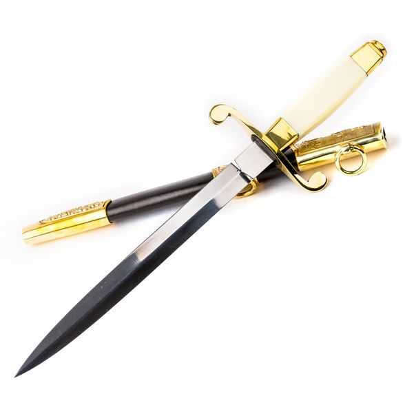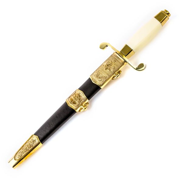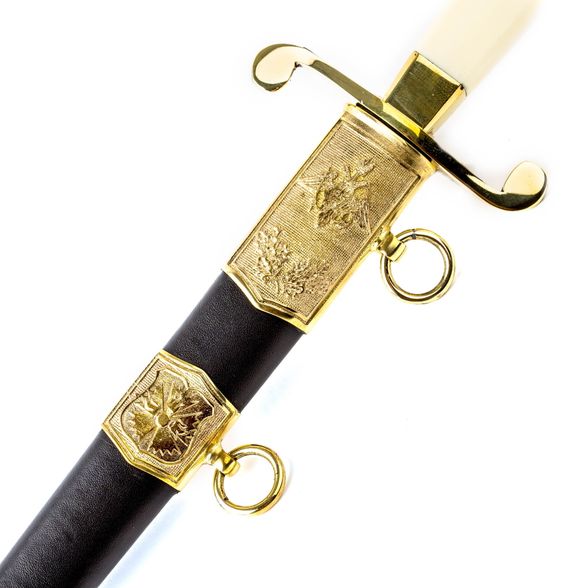 Кортик Офицерский ГРУ - это полная копия оригинала, которая идеально подойдет для создания образа или украшения интерьера. Этот кортик является точной репликой офицерского кортика, который использовался в Главном разведывательном управлении (ГРУ) Вооруженных Сил Российской Федерации. Ножны кортика выполнены из дерева и обтянуты кожей, что придает ему элегантный и стильный вид. Латунные накладки на ножнах добавляют ему дополнительный шарм и подчеркивают его военную тематику. Сталь клинка кортика нержавеющая, что позволяет ему сохранять свой внешний вид даже во влажных условиях. Рукоять кортика выполнена из пластика и латуни, что делает ее неприхотливой и каноничной. Кортик Офицерский ГРУ - это не только прекрасный аксессуар для создания образа офицера разведки, но и уникальный предмет для украшения интерьера. Он может быть размещен на полке, комоде или столе, добавляя в помещение нотку военной истории и героизма. Его качественное исполнение и стильный дизайн сделают его прекрасным дополнением к любому интерьеру. В целом, Кортик Офицерский ГРУ - это точная копия оригинала, которая идеально подойдет для создания образа или украшения интерьера. Его качественные материалы и стильный дизайн делают его прекрасным выбором для тех, кто ценит историю, качество и стиль.