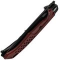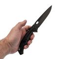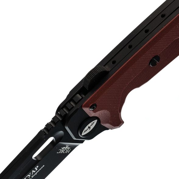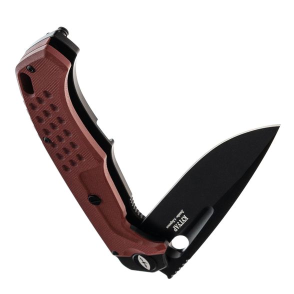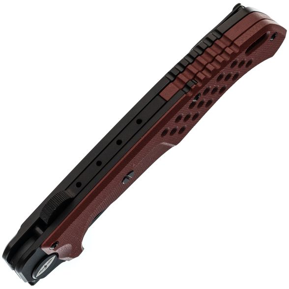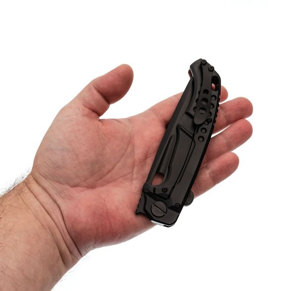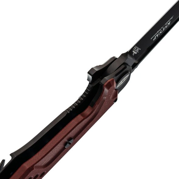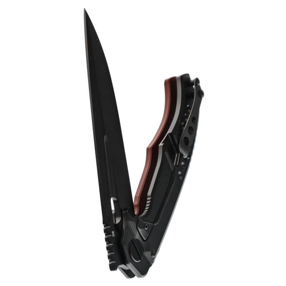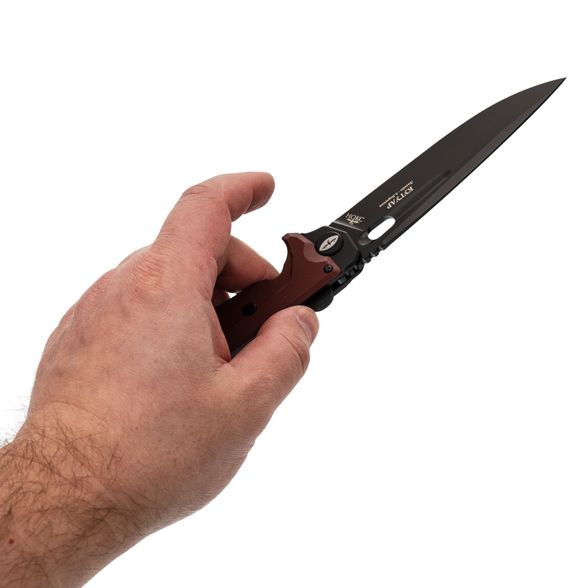 Клинок выполнен из инструментальной стали D2, которая славится своей высокой твердостью и способностью долго сохранять остроту. Такой нож вам редко придется затачивать, так как его кромка остается агрессивной даже после длительного использования. Профиль Drop-Point и высокие прямые спуски обеспечивают отличные режущие свойства: нож с легкостью справляется с продуктами и при необходимости может выполнять строгание. Открыть клинок можно с помощью отверстия в клинке или инерционным взмахом, но делать это следует осторожно.