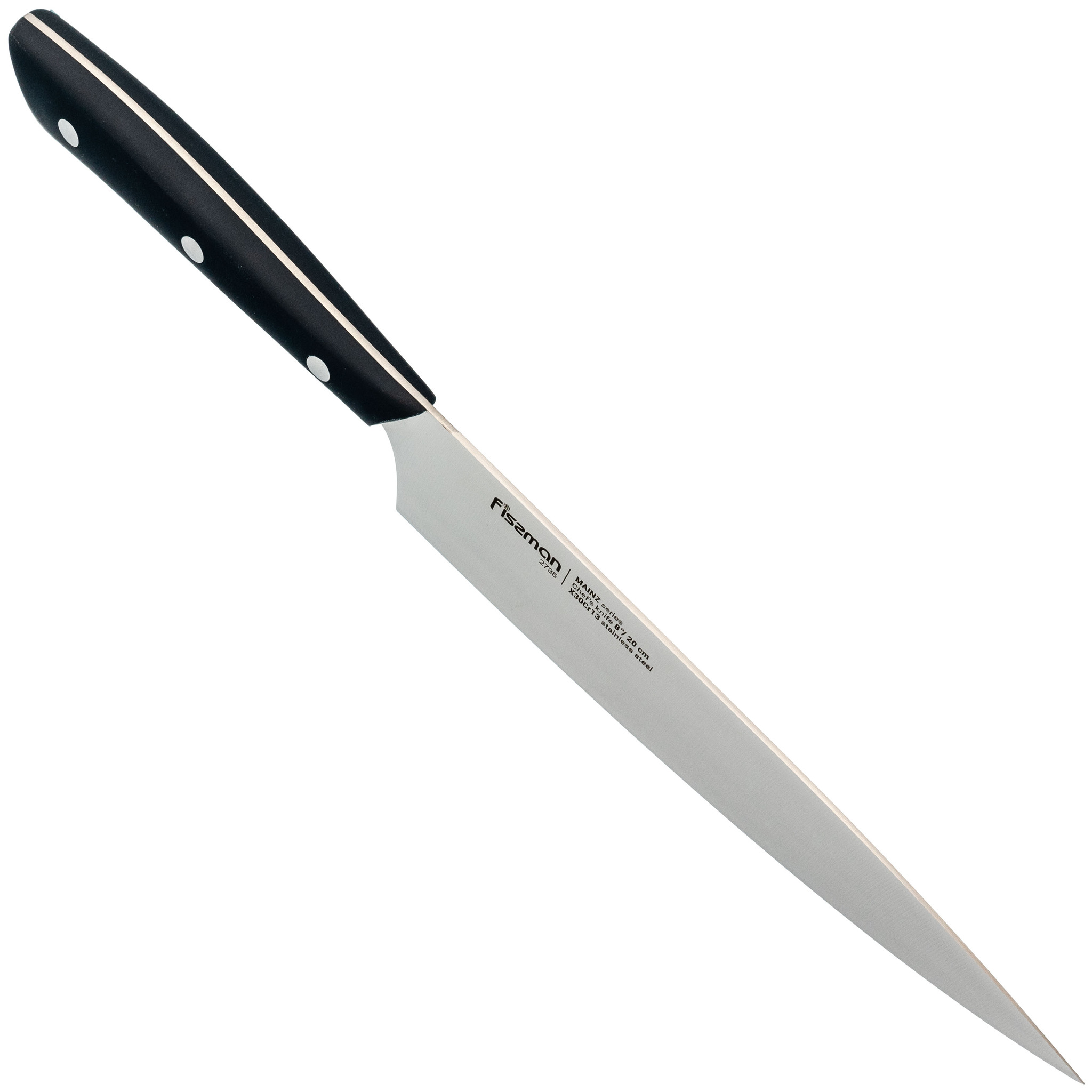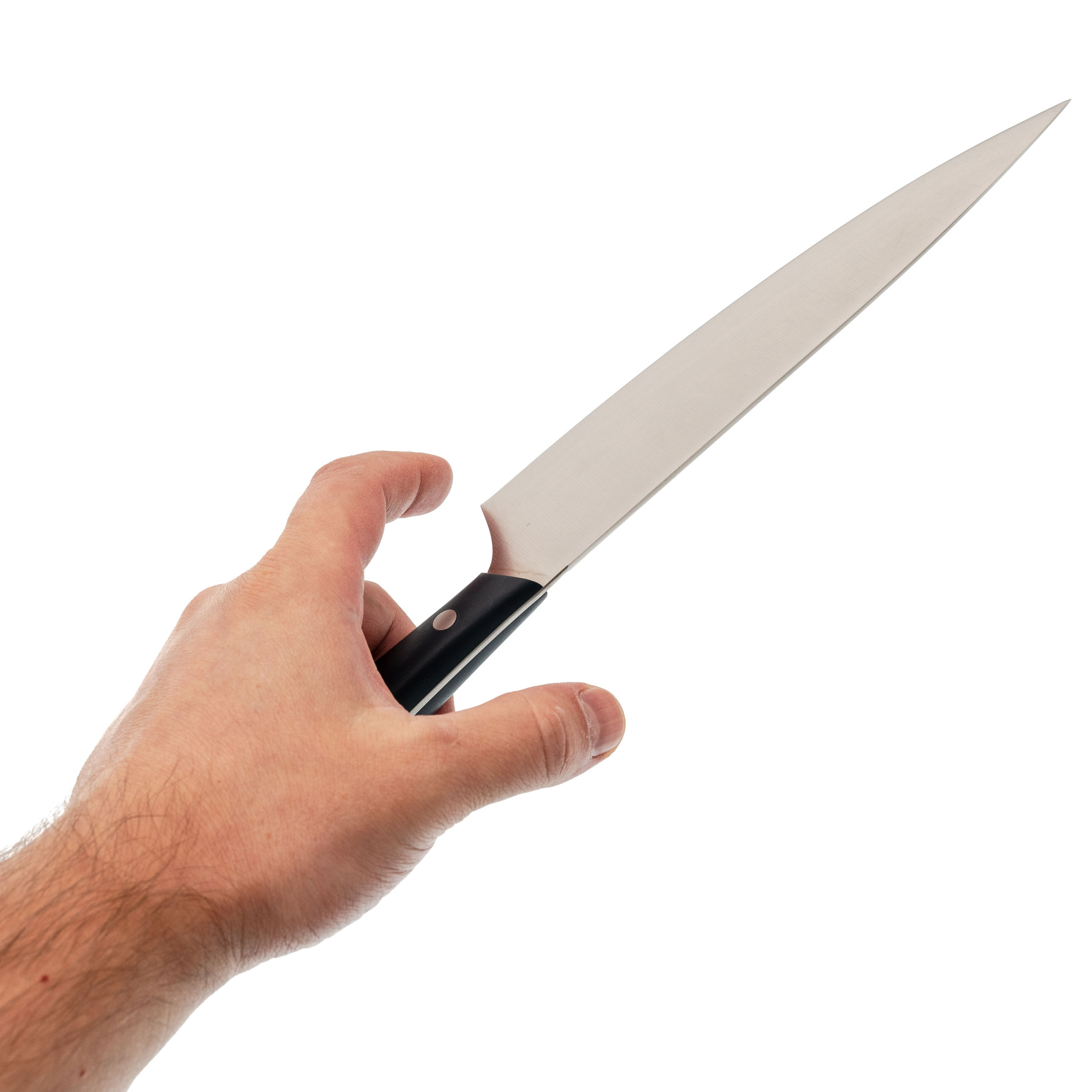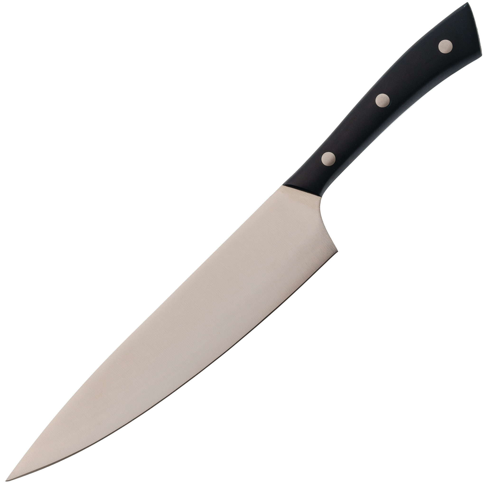 Рабочая часть длиной 20 см выполнена с учетом требований к поварским инструментам: прямой профиль и оптимальный угол заточки обеспечивают уверенную нарезку, шинковку и разделку различных продуктов. Закаленная сталь придает конструкции прочность и устойчивость к износу. Поверхность клинка легко очищается, не подвержена образованию пятен и стойко переносит контакт с продуктами разной плотности и влажности.