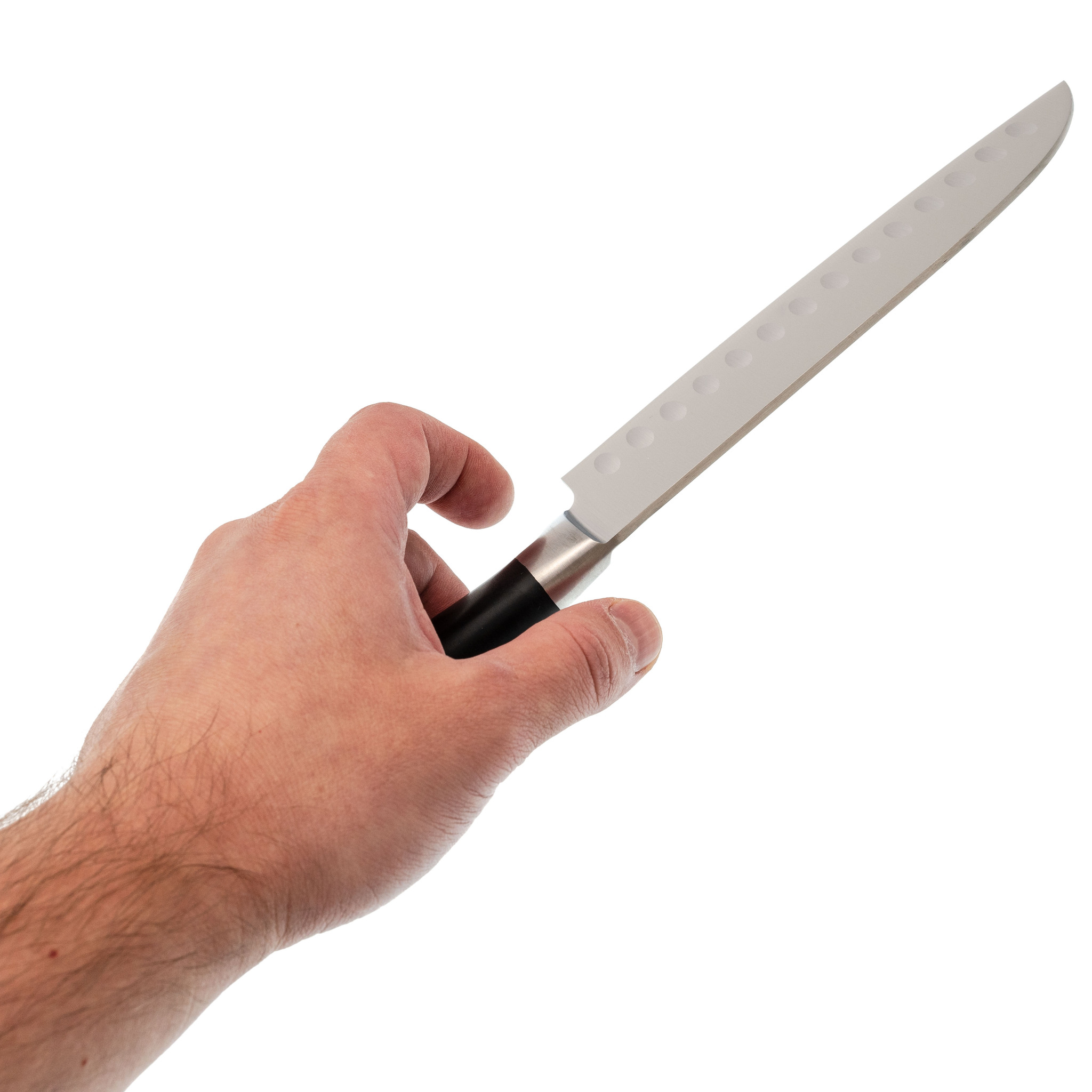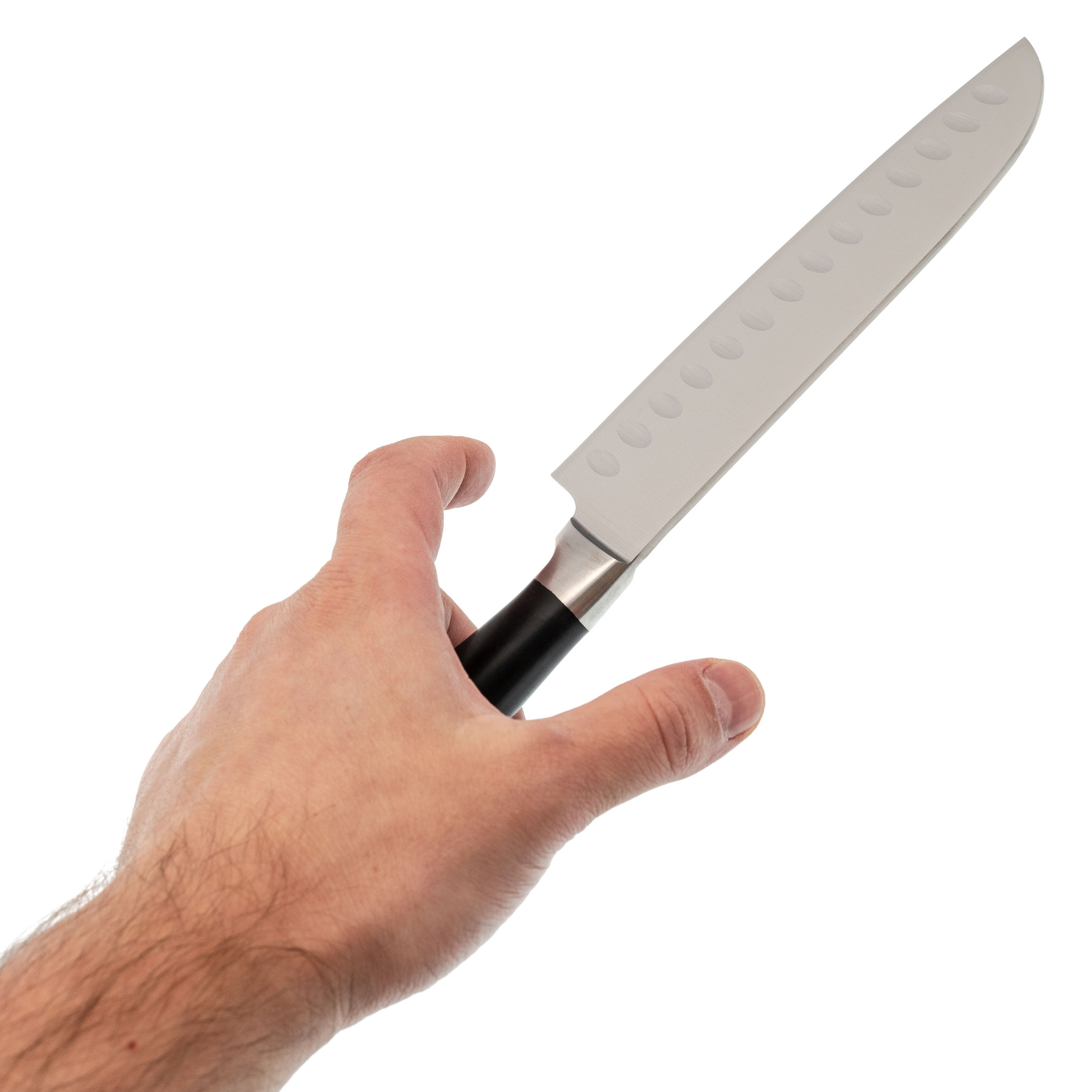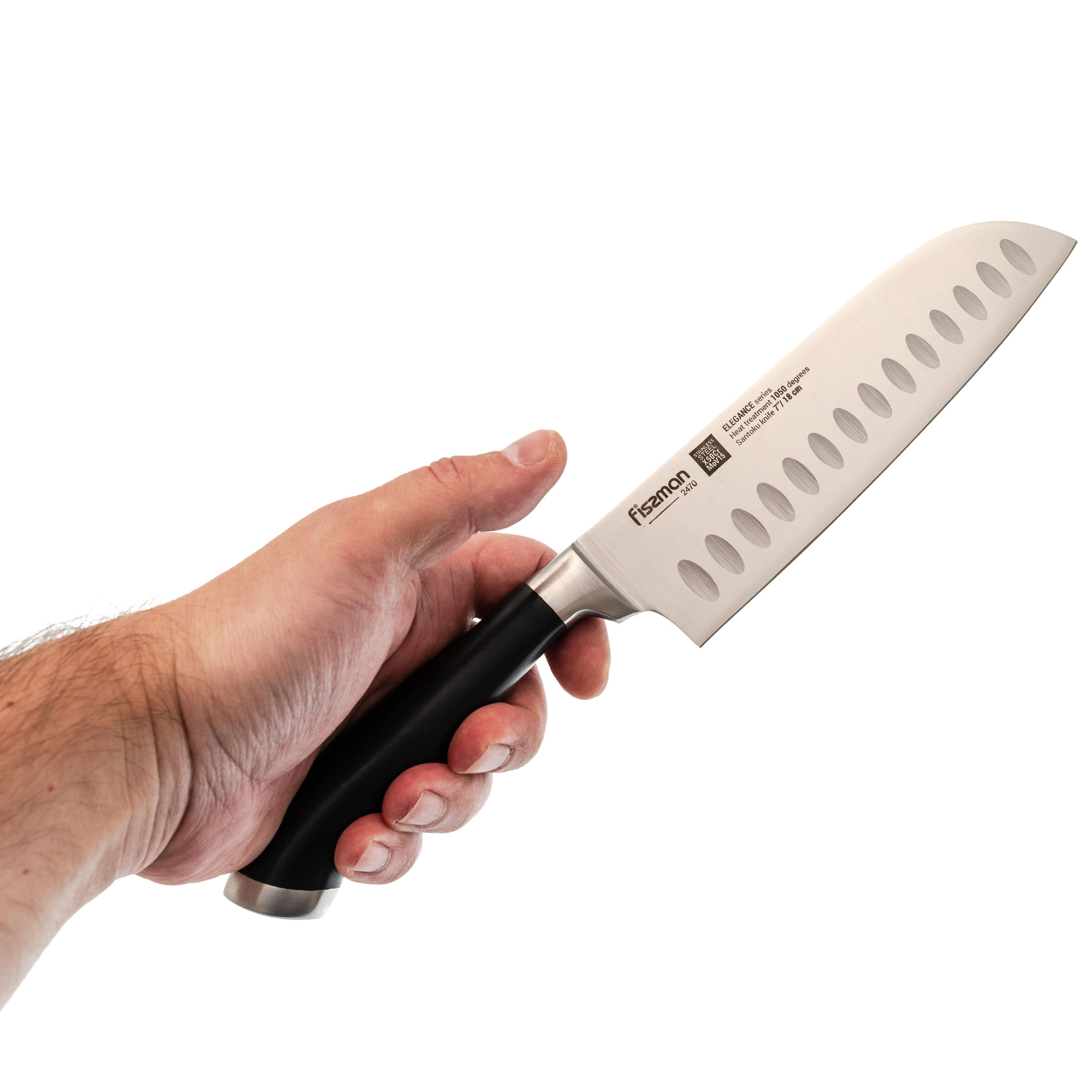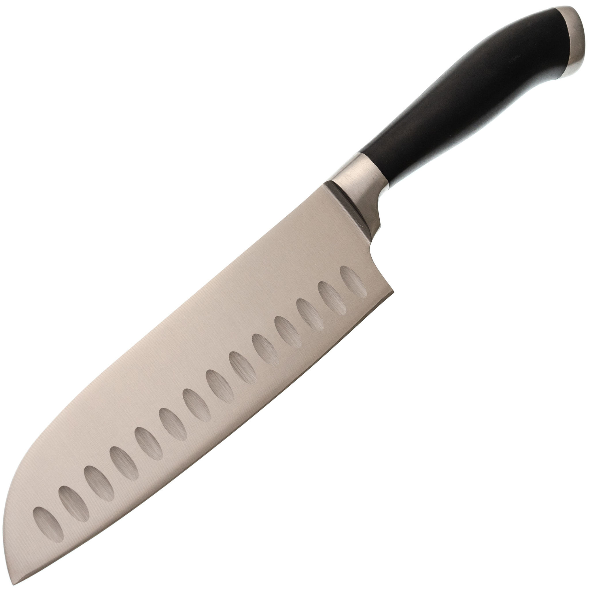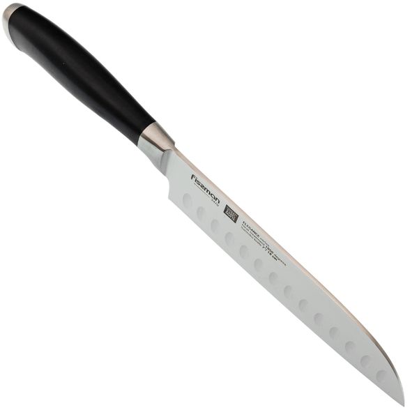 Форма Santoku обеспечивает легкую и контролируемую нарезку продуктов. Длина клинка 18 см делает его универсальным для самых разных задач на кухне. Особенность модели - углубления на полотне. Эти выемки создают воздушную прослойку между металлом и продуктами, что снижает прилипаемость и повышает эффективность работы. Такой дизайн особенно удобен при шинковке овощей, нарезке сыра и других ингредиентов с мягкой текстурой.