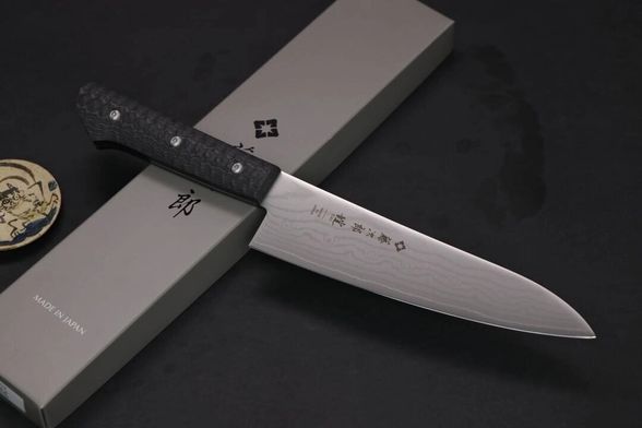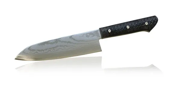 Клинок ножа представляет собой уникальное сочетание технологий. Он изготовлен из ламината, состоящего из сердечника VG-10, известного своей способностью долго сохранять заточку и устойчивостью к коррозии, и обкладок из дамаска, придающих ножу эстетичный внешний вид. Такая конструкция позволяет достичь высокой твёрдости сердечника. Прямые спуски и широкая форма клинка обеспечивают отличное качество реза, а ручная заточка с финишной обработкой 8000 грит делает кромку невероятно острой и устойчивой.