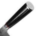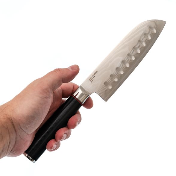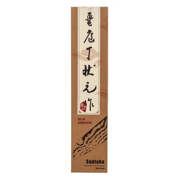 Клинок изготовлен из ламината: режущая часть из японской стали VG-10 обеспечивает длительное удержание заточки и хорошее сопротивление коррозии, а внешние слои - из дамаска. Использование дамаска позволяет достичь более высокой твердости сердечника, что продлевает срок сохранения остроты режущей кромки. Прямые спуски от тонкого обуха обеспечивают превосходную режущую геометрию.