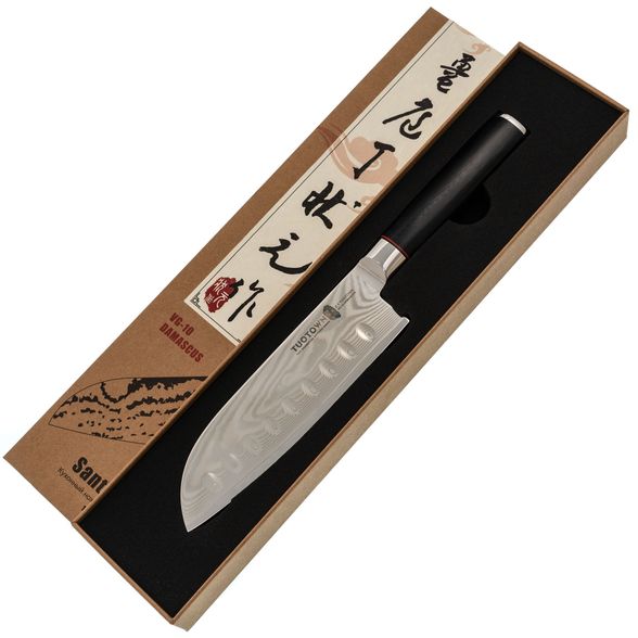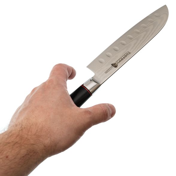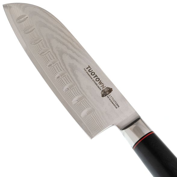 Сантоку - это традиционный японский поварской нож, аналог европейского шеф-ножа. Он предназначен для универсального использования на кухне, особенно удобен для работы с крупными продуктами, такими как мясо, рыба и овощи. Большой Сантоку от Tuotown, как и все ножи этого бренда, предлагает исключительное сочетание цены и качества.