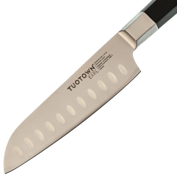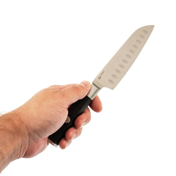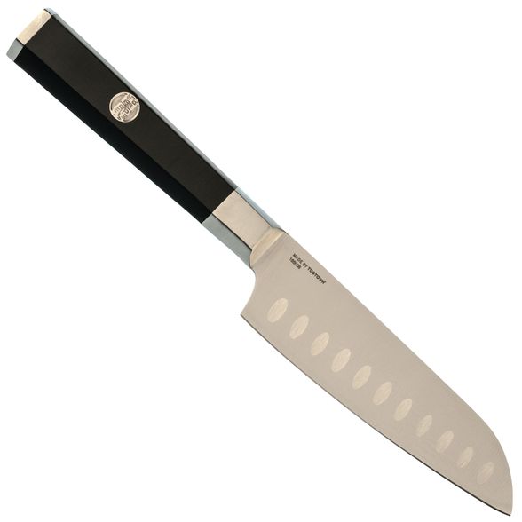 Отличный сантоку,когда надо нашинковать небольшое количество продуктов, зелени. Сталь хорошо держит заточку.
