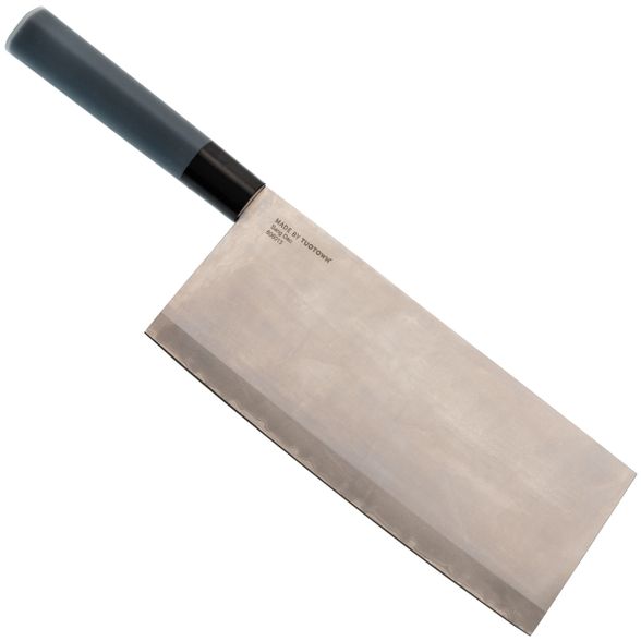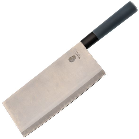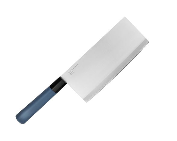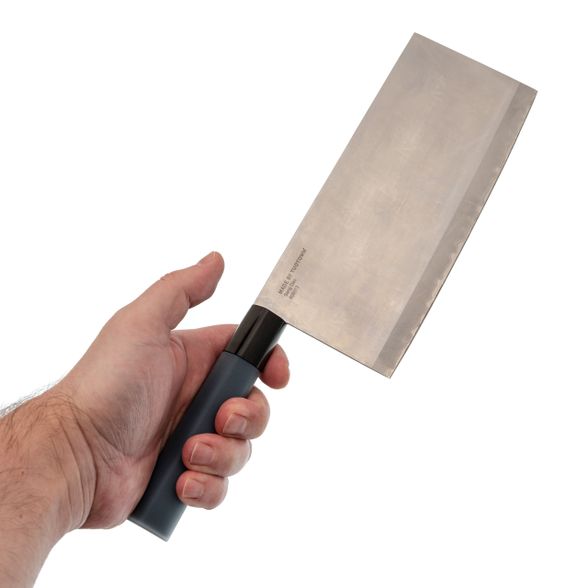 Клинок широкий, но неожиданно тонкий. Сведение аккуратное, без лишнего мяса за кромкой, поэтому нож легко входит в продукт и не клинит при шинковке. Такой формат особенно хорош для капусты, лука и зелени - рез получается чистым и контролируемым.
