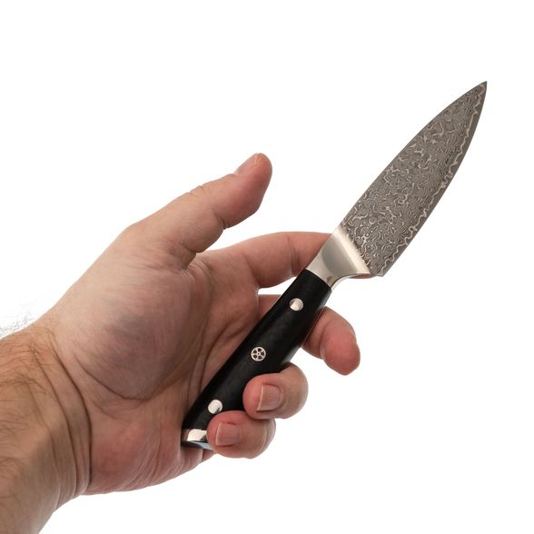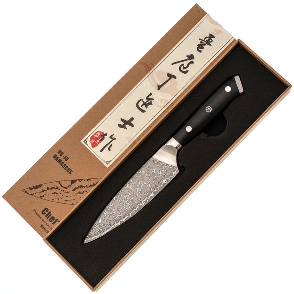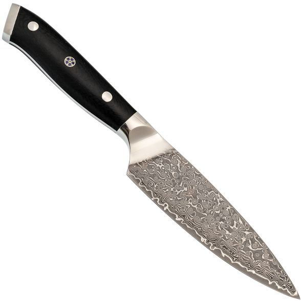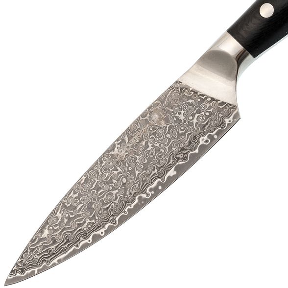 Клинок ножа изготовлен из уникального ламината, сочетающего в себе японскую сталь VG-10 и нержавеющий дамаск. Сердечник из стали VG-10 обеспечивает превосходную заточку и коррозионную стойкость, а обкладки из дамасской стали позволяют достичь высокой твёрдости. Такое сочетание материалов придаёт клинку не только отличные рабочие характеристики, но и привлекательный внешний вид. Прямые спуски и тонкий обух обеспечивают идеальное резание, а универсальный профиль позволяет справляться с любыми кухонными задачами.