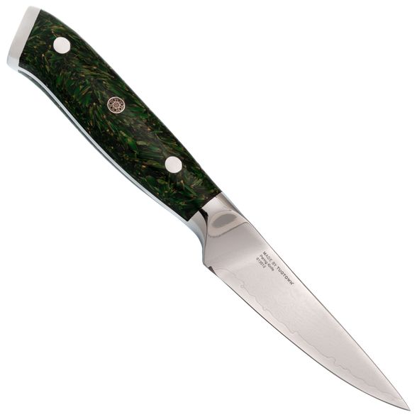 Клинок изготовлен из необычного ламината: сердечник из высококачественной VG-10, которую обрамляют обкладки из дамаска. Такое сочетание обеспечивает идеальную термообработку, раскрывая весь потенциал стали. В результате нож получает превосходную режущую способность, а необычная геометрия позволяет деликатно работать с продуктами.