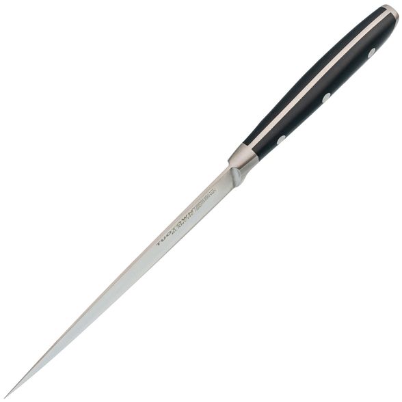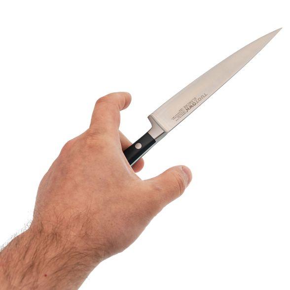 Клинок ножа имеет прямые спуски от обуха и очень тонкое лезвие - такая форма позволяет легко входить в продукты и обеспечивать чистый, аккуратный срез. Это особенно важно при работе с мягкими или деликатными ингредиентами, где важно сохранить форму и текстуру. Геометрия клинка продумана до мелочей: он обеспечивает минимальное сопротивление при нарезке и даёт отличный контроль над движением.