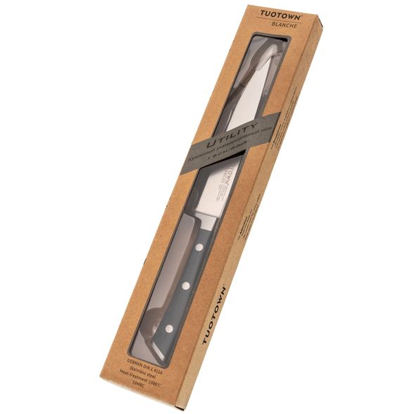 Кухонный нож Универсальный TuoTown из серии Blanche - это практичный и сбалансированный инструмент, подходящий как для повседневных задач дома, так и для активной работы на профессиональной кухне. Универсальныйьный нож - один из ключевых элементов в арсенале повара: он пригодится для нарезки овощей, разделки мяса, работы с рыбой и фруктами. Благодаря своей форме и размерам, этот нож справляется с большинством кулинарных операций без необходимости постоянно менять инструмент.