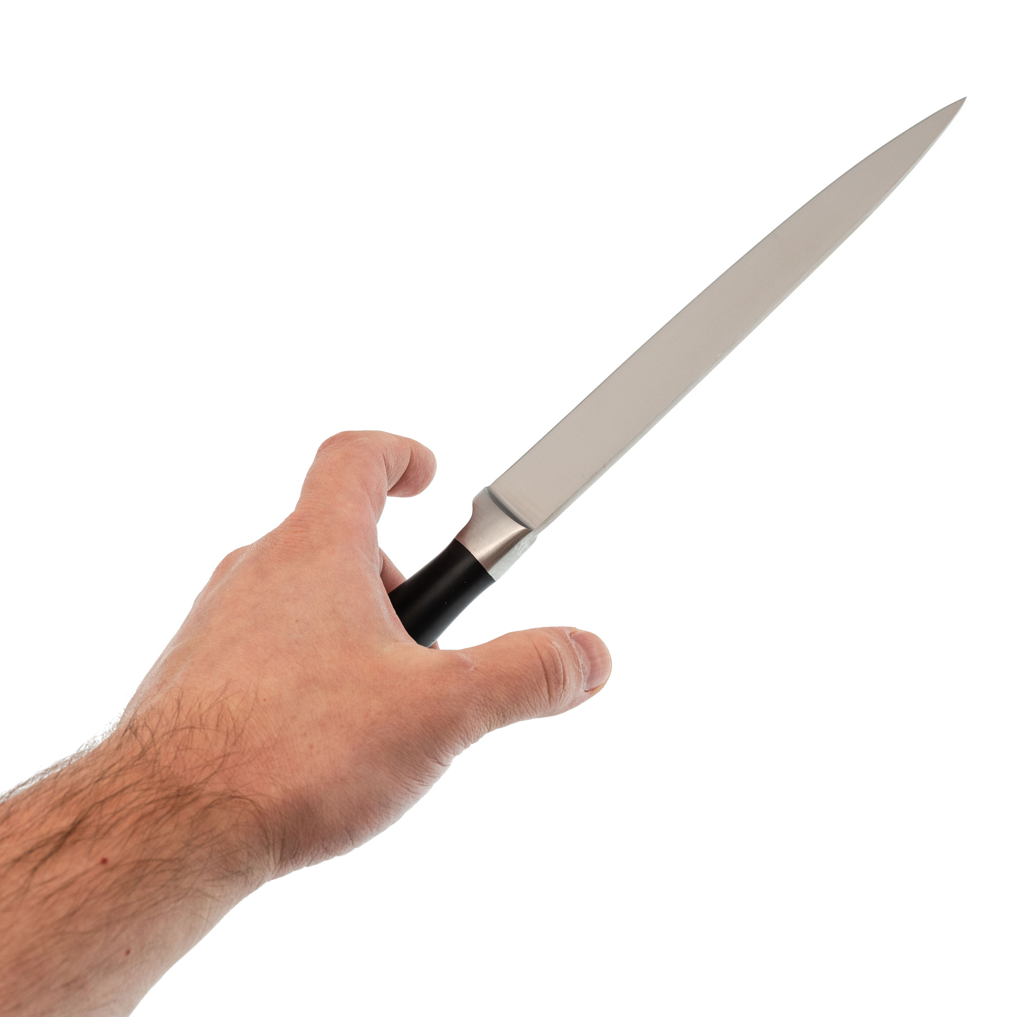 Полотно длиной 20 см и толщиной 2 мм обеспечивает универсальность в применении. Такая геометрия удобна как для точной нарезки, так и для более силовых задач. Сталь X50CrMoV15 демонстрирует устойчивость к износу и при этом легко восстанавливает заточку, что особенно важно для повседневного кухонного использования. Симметричная форма и плавный изгиб режущей кромки способствуют комфортной работе под разными углами.