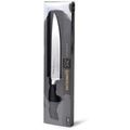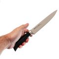 Черная рукоять выполнена из прочного пластика, что делает ее легкой и удобной при длительной работе. Рельефная форма и плавные линии обеспечивают уверенный хват, а больстер защищает руку и улучшает баланс инструмента. Такое сочетание делает Katsumoto надежным выбором для профессионалов и любителей, стремящихся к комфорту и эффективности на кухне.
