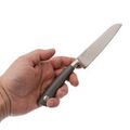 Этот нож является универсальным решением, сочетая в себе преимущества большого шеф-ножа и меньшего по размеру овощного ножа. Его размер и форма делают его невероятно многофункциональным. Клинок имеет профиль, напоминающий ножи сантоку, что привлечет внимание любителей японской кухонной культуры. Изготовленный из немецкой нержавеющей стали 1.4116, этот нож предлагает отличное сочетание коррозионной стойкости и легкости заточки. Сталь 1.4116 широко используется в европейских кухонных ножах и зарекомендовала себя как надежный и доступный вариант.