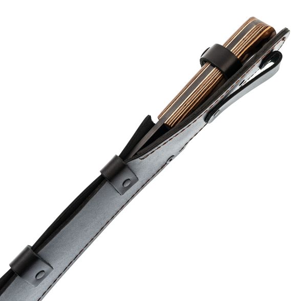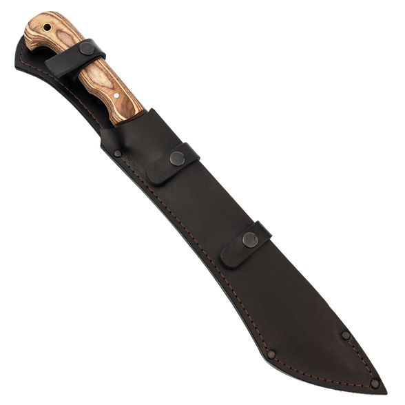 В комплекте с мачете идут прочные ножны, выполненные из качественной натуральной кожи. Жёсткая конструкция и надежная фиксация лезвия обеспечивают максимальную защиту от случайных повреждений во время переноски. Регулируемые ремни позволяют закрепить инструмент на поясе или рюкзаке, сохраняя быстрый доступ в любой момент. Классическое оформление ножен подчёркивает солидность изделия и делает его органичной частью любого походного снаряжения.