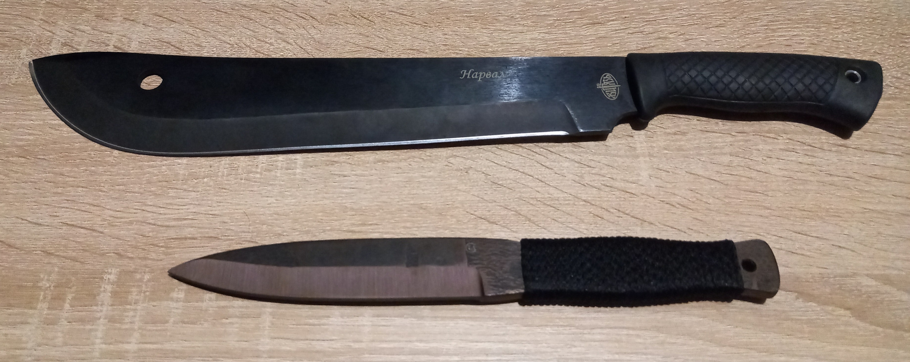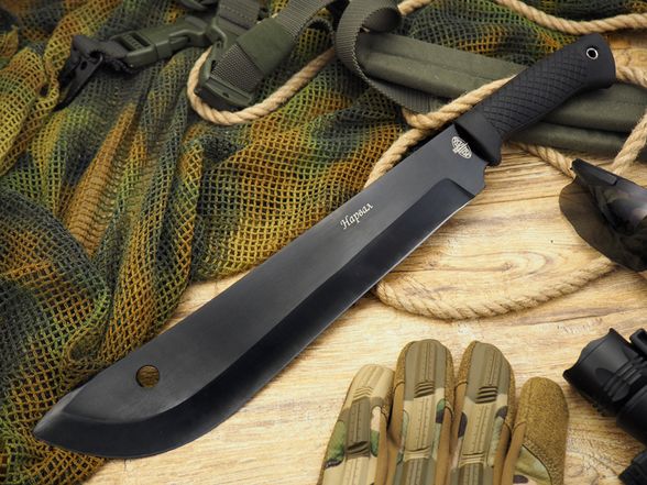 Широкий клинок с прямыми спусками и массивным сведением рассчитан на тяжёлую эксплуатацию. Черное антикоррозионное покрытие дополнительно защищает металл от воздействия влаги и грязи. Сталь У8 хорошо показывает себя при силовой рубке и долговечна даже при интенсивной эксплуатации.