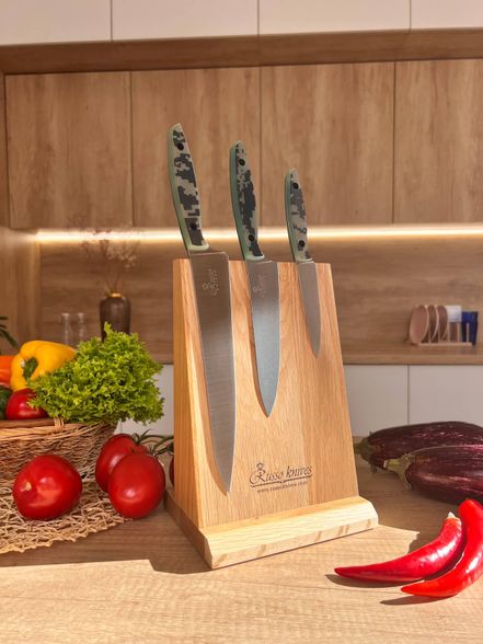 Режущая кромка ножа при таком хранении не соприкасается с поверхностью подставки, что позволяет дольше сохранять ее остроту и целостность.