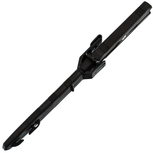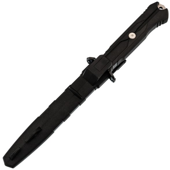 Пластик, чёрный, с подвесом под Molle. Нож держится за счёт тугого хода и защёлки. Слышите щелчок - значит, сел надёжно. Конструкция продумана так, чтобы не терять нож в движении, но и не бороться с ним, когда нужно быстро достать.