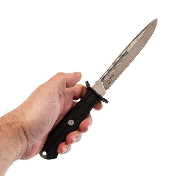 Drop-Point со скошенным кончиком - форма, которая прижилась у охотников и туристов. Узкий и толстый клинок прощает ошибки: им можно поддеть, подковырнуть, использовать как рычаг. На части лезвия насечка-серрейтор, она же пила по твёрдым волокнам. Покрытие Stonewash - без глянца, практичное, скрывающее мелкие потёртости.