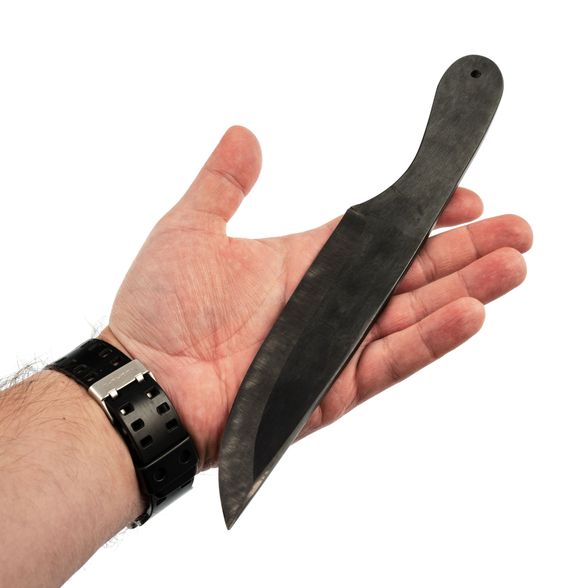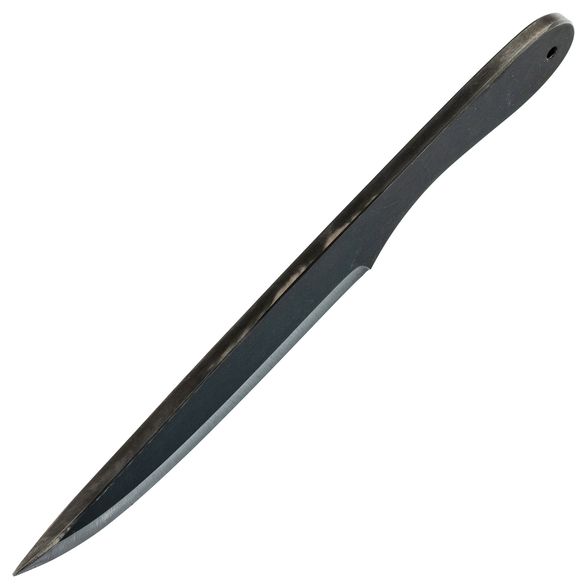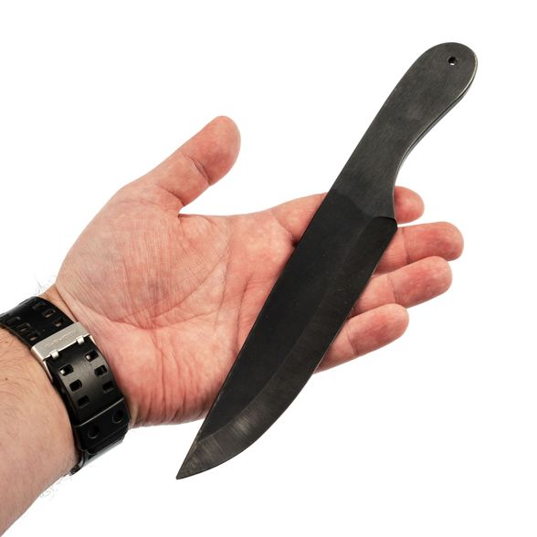 Спортивный НОЖ «ПРОФЕССИОНАЛ-4» это большой и надежный нож для броска на средние и длинные дистанции. Эту модель можно смело рекомендовать в качестве базового ножа для тех, кто освоил основные навыки спортивного броска и не собирается останавливаться на достигнутом. Нож имеет классическую геометрию — плавное понижение кончика, спуски выведены, но режущая кромки нет. Такая особенность снижает вероятность получения травмы при удержании ножа за клинок в момент броска. Нож выполнен из кованой стали, которая в процессе термической обработке закалена до 42-47HRC. Такой уровень твердости позволяет сохранить оптимальный показатель ударной вязкости при выполнении сильных бросков.