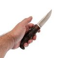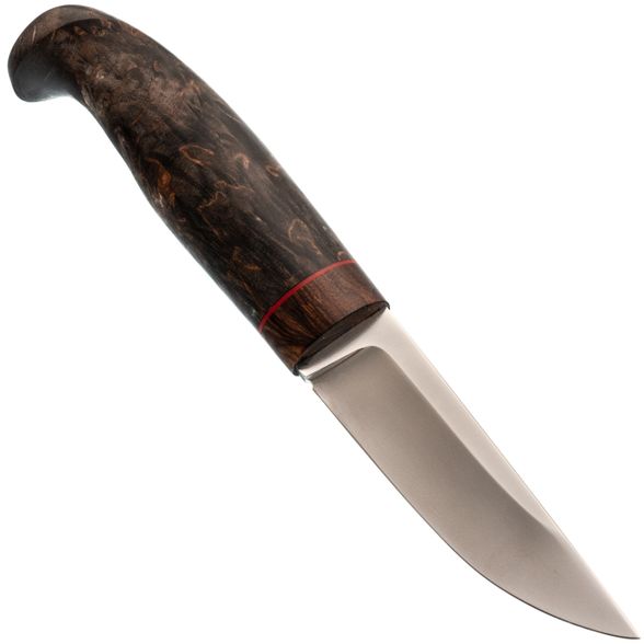 Форма рукояти продумана так, чтобы наполнять руку и не утомлять её даже после долгой работы. Лёгкий "грибок" на тыльнике - фирменная черта финских ножей, которая добавляет надёжности в хвате и немного скандинавского характера.