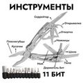 Инструменты: Плоскогубцы, кусачки, нож с прямым лезвием, нож с серрейторным лезвием, пила по древесине, плоскогубцы, ножницы, шлицевая отвертка, шило, инструмент для зачистки проводов, нож для консервных банок, открывалка для бутылок, инструмент для захвата гаек и цилиндров, держатель для бит