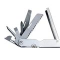 Инструмены: пассатижи, кусачки для проволоки, пила по дереву, лезвие прямое/серрейторное, напильник, отвертка, отвертка Philips, переходник под стандартный адаптер для шестигранных отверток, шило, открывалка для бутылок/консервов, ножницы, линейки, кольцо для шнурка.