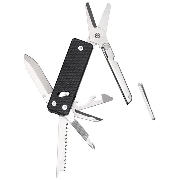 Инструменты: Нож с прямым лезвием, ножницы, пила, пинцет, крестовая и плоская отвертки, стеклобой, шило, отверстие для продевания нити, пилочка для ногтей, сантиметровая линейка, открывалки для консервных банок и для бутылок, битодержатель