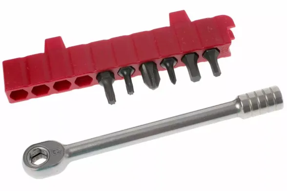 - Ключ с гнездом под насадки - основа для работы с битами.