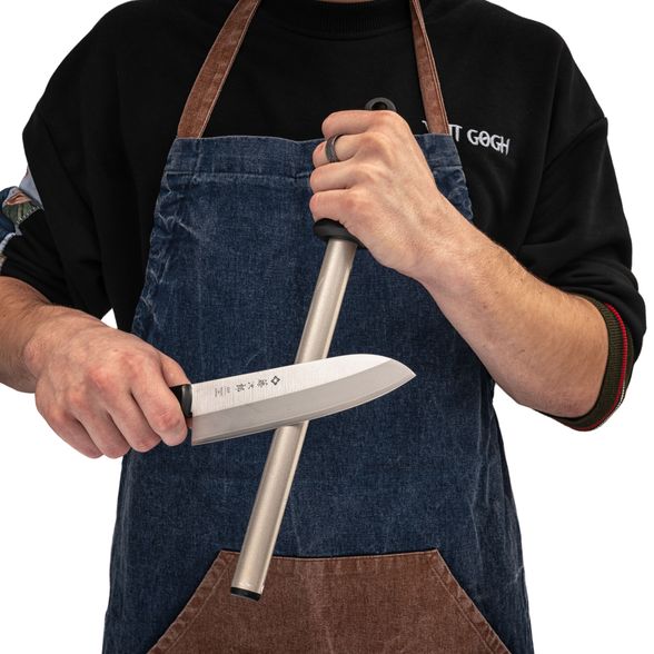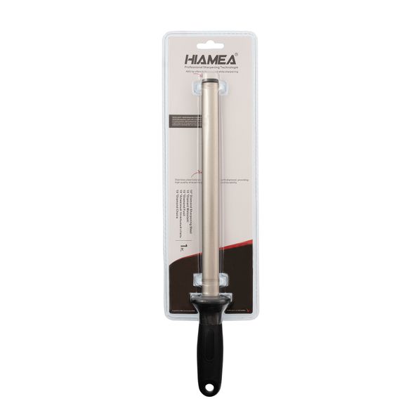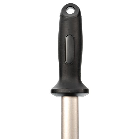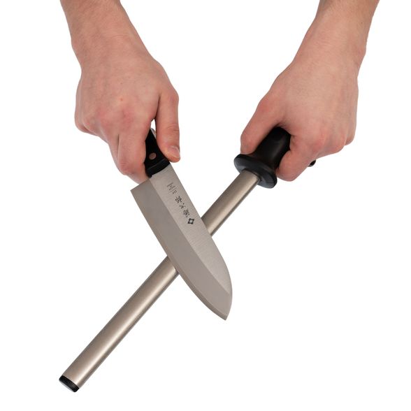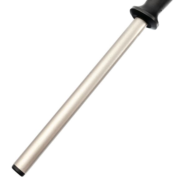 Алмазный мусат - простое и эффективное приспособление для заточки и правки ножей. Несколькими движениями вы устраните неровности режущей кромки и вернёте ножу рабочий рез. Мусат оснащён удобной рукоятью из пластика ABS, имеющей гарду и кольцо, в которое можно продеть шнур и между использованиями подвешивать прибор на крючок. Мусат можно с равным успехом использовать на кухне или взять с собой в поход. Если вы приобретаете алмазный мусат впервые, обязательно посмотрите короткое обучающее видео на этой странице.