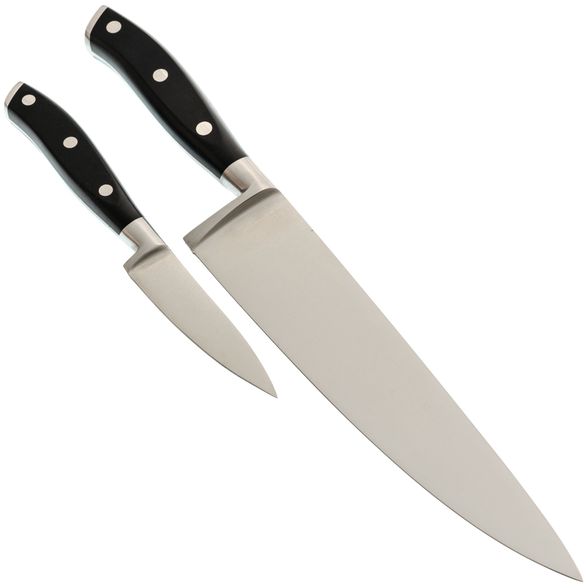 Этот набор - отличное решение для тех, кто предпочитает простоту и практичность. В него входят два ключевых ножа, которые необходимы в каждом кулинарном арсенале: Шеф-нож и нож для овощей. Шеф-нож с длинным и широким лезвием - универсальный инструмент для нарезки любых ингредиентов. Он справляется с крупными кусками мяса и рыбы, а также с мелкими фруктами и овощами, обеспечивая надежность и многофункциональность. Овощной нож, оснащенный более коротким и тонким лезвием, идеален для более тонкой работы, требующей точности. Он позволяет аккуратно вырезать и нарезать мелкие продукты, что особенно важно при выполнении сложных кулинарных приемов.