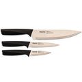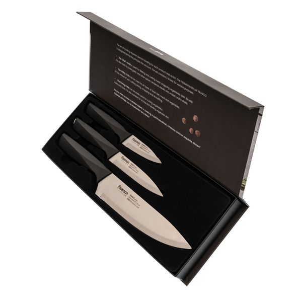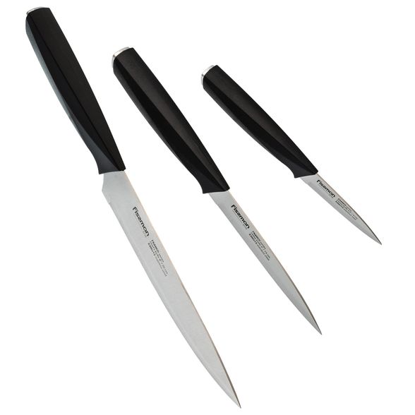 Каждый инструмент из набора имеет собственное назначение: поварской предназначен для нарезки и шинковки, универсальный - для работы с продуктами средней величины, а овощной идеально подходит для мелкой и точной работы. Гладкая заточка клинков обеспечивает чистый срез и комфорт в процессе приготовления, а сталь с оптимальной твердостью сохраняет рабочие качества при регулярном использовании.