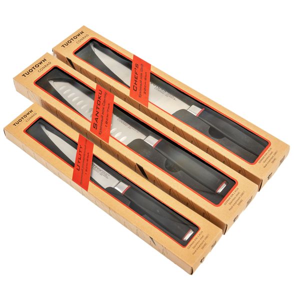 Набор кухонных ножей CONRAD - идеальный выбор для тех, кто хочет обновить свои кухонные ножи. В этот набор входят три высококачественных и острых ножа: поварской нож, нож сантоку и универсальный нож. Каждый нож изготовлен из прочной нержавеющей стали и имеет эргономичную рукоятку из ABS-пластика для удобства и контроля во время использования. Эти ножи не только функциональны на кухне, но и станут отличным подарком для любого домашнего повара или начинающего кулинара. Если вы хотите купить острые ножи для себя или кого-то еще, набор кухонных ножей CONRAD с тремя ножами в комплекте - определенно хороший выбор.