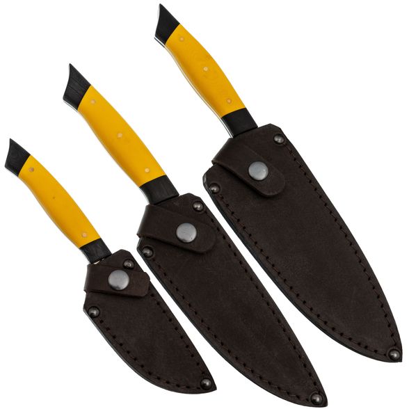 Каждый нож комплектуется чехлом из натуральной кожи, который защитит клинок во время транспортировки и удобен для кратковременного хранения. Это решение подходит для тех, кто ценит порядок на кухне и заботится о сохранности своих инструментов.
