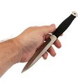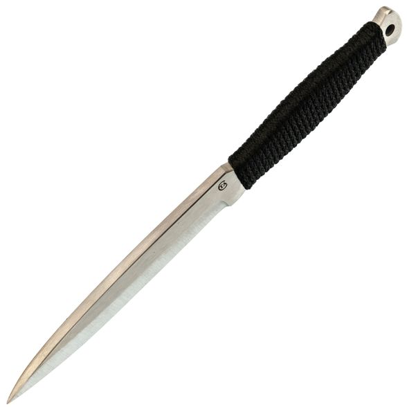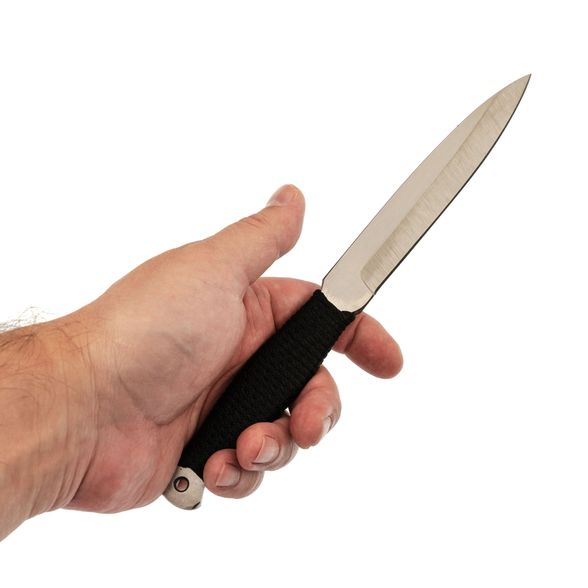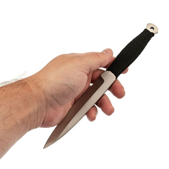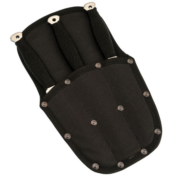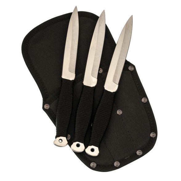 Рукоять обмотана шнуром черного цвета, что обеспечивает удобство и надежный хват. Поставляются набор в удобном нейлоновом чехле из кордуры с подвесом на пояс, что позволяет брать спортивную принадлежность с собой и практиковать метание в любом месте. Этот тип ножей предназначен только для метания, но ими можно выполнять некоторые операции на кухне. Конечно, для шеф-повара он не пойдет из-за профиля.