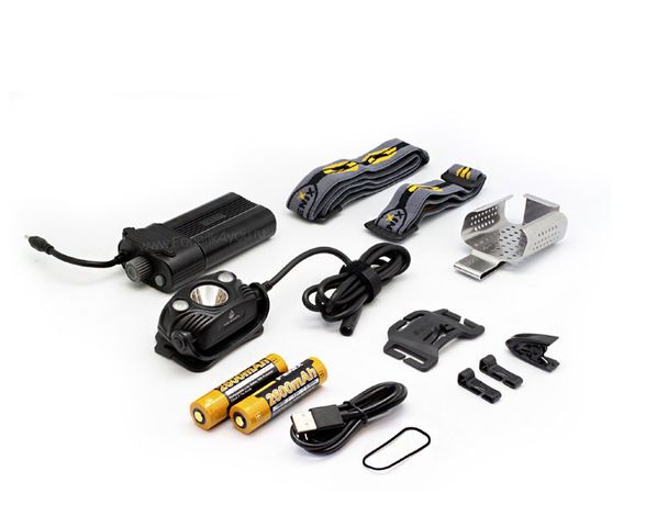 Комплектация: фонарь, ремешок для ношения на голове, клипса для крепления кабеля, крепление к наголовному ремешку, 2 пряжки для кабеля, клипса на ремень, кабель для зарядки через USB, 2 аккумулятора 18650, запасное силиконовое кольцо для уплотнения.