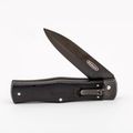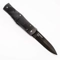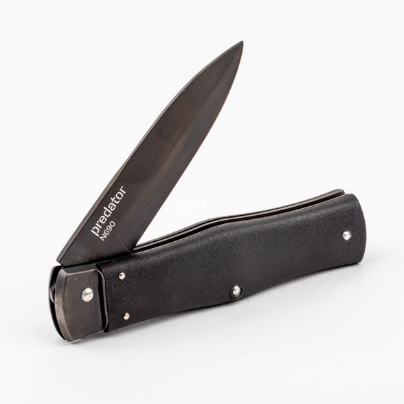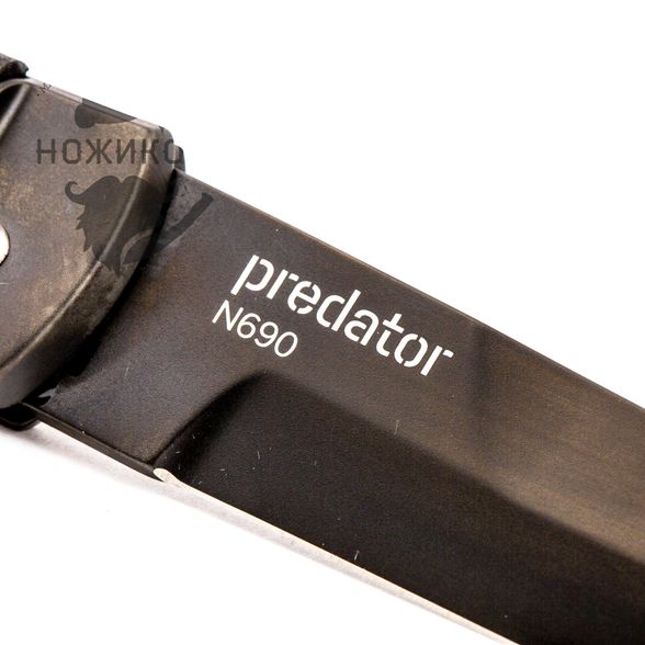 Клинок N690 с чёрным покрытием: металл N690 сочетает коррозионную стойкость и долгое удержание кромки; покрытие уменьшает блики и дополнительно защищает поверхность.