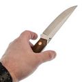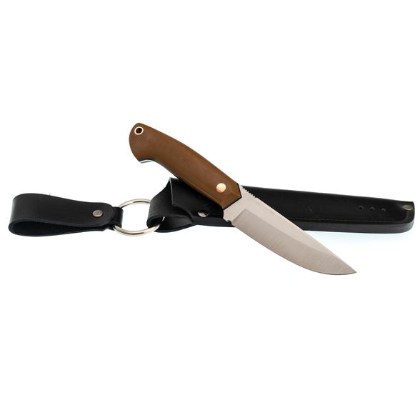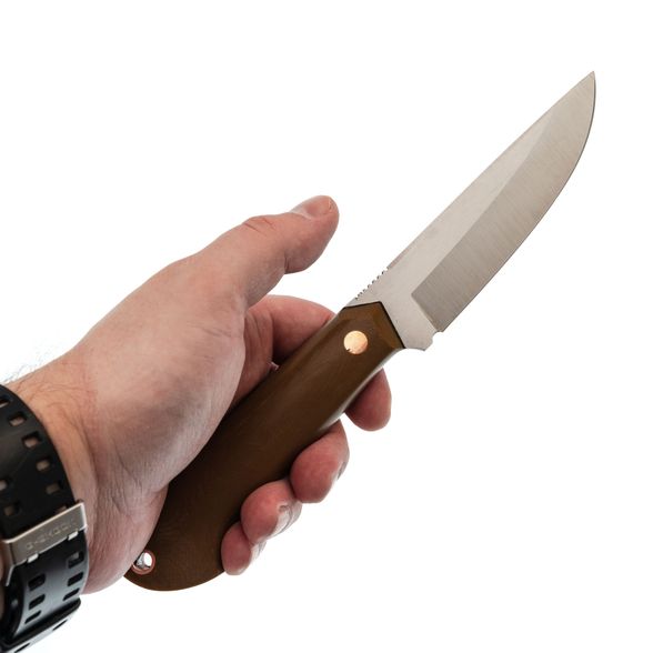 Рукоять ножа выполнена по технологии Full-Tang, что обеспечивает ее прочность и удобство в обслуживании. Накладки из стеклотекстолита G10 не боятся воздействия окружающей среды и выдерживают различные нагрузки. Их закругленная форма позволяет уверенно держать нож в руке, а объем заполняет ладонь, предотвращая дискомфорт при работе.