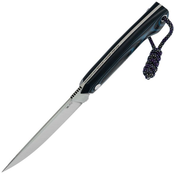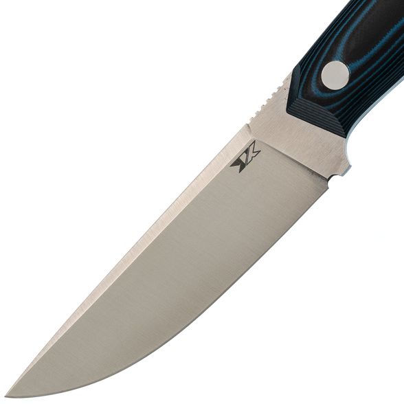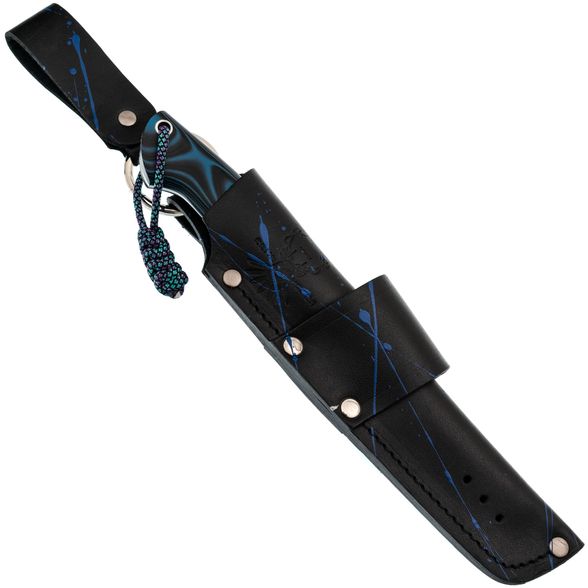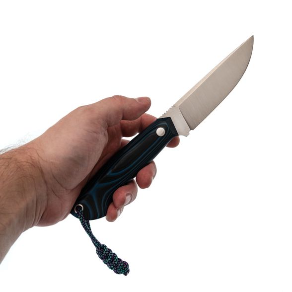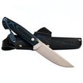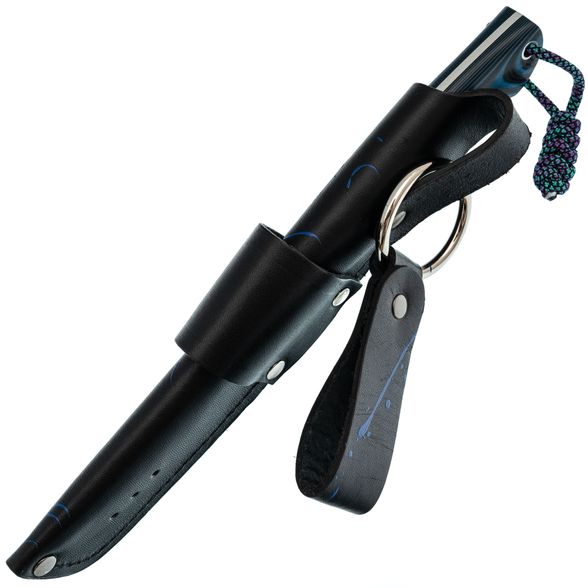 Рукоять выполнена из стеклотекстолита G10, известного своей прочностью и устойчивостью к внешним воздействиям. Этот материал идеально подходит для суровых условий, предлагая долговечность и надежность. Форма рукояти тщательно проработана, чтобы удобно заполнять руку, позволяя работать без усталости. Контрастное сочетание черного и синего цветов добавляет рукояти выразительности, делая ее ярким акцентом в дизайне ножа.