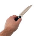 Клинок изготовлен из стали PGK, которая отличается высоким содержанием углерода. Эта сталь обеспечивает клинку впечатляющую твердость и длительное удержание остроты, позволяя затачивать его на тонкие углы. Хотя коррозионная стойкость стали не самая высокая, при должном уходе с ней не возникнет проблем. Такая сталь особенно хороша для разделочных ножей, где важна максимальная острота при минимальном контакте с влагой. Криогенная термообработка, применяемая мастерской, улучшает характеристики стали, делая ее еще более прочной. Классическая форма с прямым обухом и высокими прямыми спусками дает клинку отличные режущие свойства, что особенно важно для охотничьего ножа. Каждое лезвие затачивается вручную, обеспечивая непревзойденную остроту.