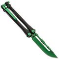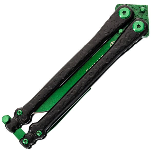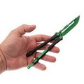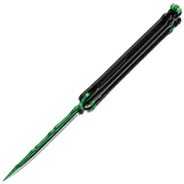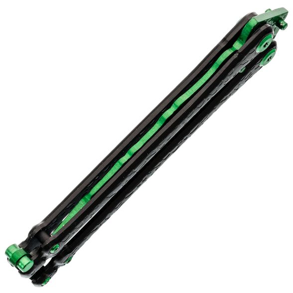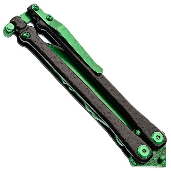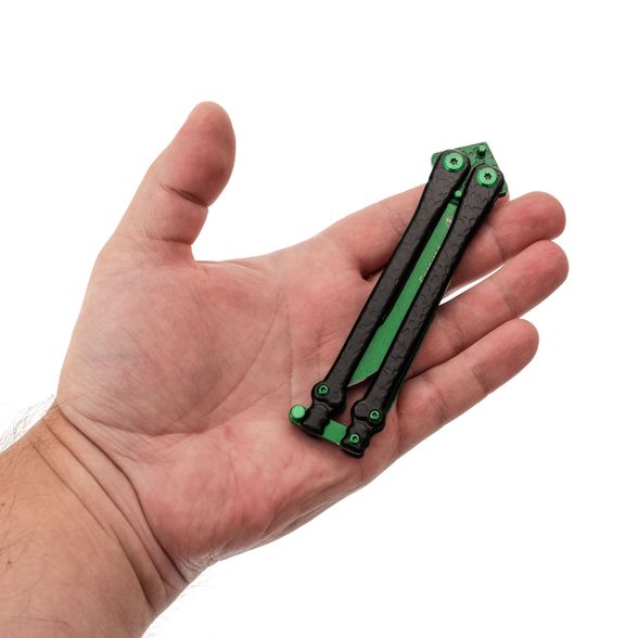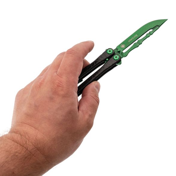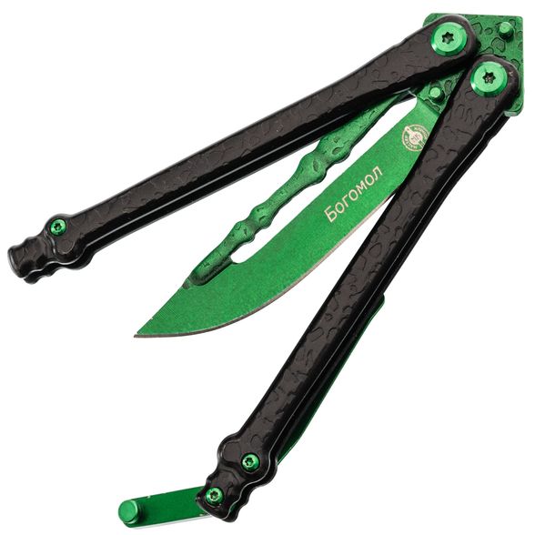 Нож-бабочка (балисонг) Богомол - это стильный утилитарный аксессуар, который станет надежным помощником в выполнении различных городских и бытовых задач. С его помощью можно вскрывать упаковки и конверты, затачивать карандаши или нарезать различные продукты. Кроме того, нож бабочка Богомол подойдет для обучения флиппингу новичков и отрабатывания трюков профессионалами. Клинок данной модели выполнен из стали марки 440 с твердостью закалки 52-54 и хорошей устойчивостью к коррозии. Изюминкой лезвия является его покрытие ярко-зеленого цвета, придающее изделию уникальность. Стальная рукоять состоит из двух половин, имеющих овальное сечение. Благодаря этому нож хорошо ложится в руку и позволяет комфортно пользоваться им на протяжении долгого времени. В комплект входят прочные нейлоновые ножны.