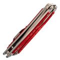 Для удобства ношения в кармане нож оснащён боковой клипсой. Материал рукояти - стеклотекстолит G10 насыщенного красного цвета. Нож комплектуется чехлом из кордуры.