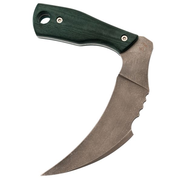 Угол между рукоятью и клинком близок к 90 градусам - это не только дань образу косы, но и продуманная эргономика. Кисть располагается естественно, запястье не выламывается. Нейтральное сечение рукояти позволяет менять хваты на ходу. Сквозной монтаж накладок из микарты на стальном хвостовике гарантирует, что нож не разболтается даже через годы.