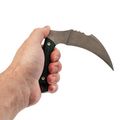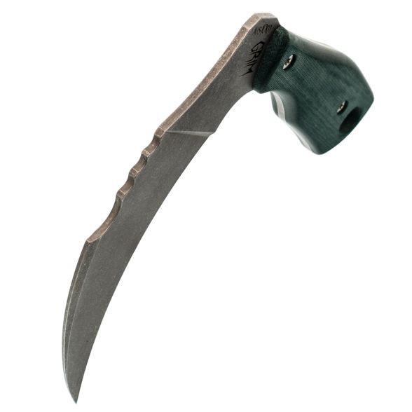 Hawkbill - это классика для ножей, где нужен контролируемый рез на себя. Клинок Грим имеет прямые спуски от обуха, так что режущая кромка тонкая и острая. Сводится он довольно агрессивно, но зато любые режущие операции выполняет на ура. Благодаря форме крюка, точка приложения силы смещается к пятке, что дает рычаг.