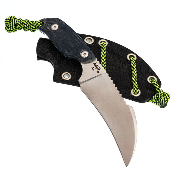 Формованные ножны из Kydex надёжно фиксируют нож, в том числе при ношении рукоятью вниз. В комплект входит подвес из паракорда, позволяющий разместить нож на ремне или снаряжении в удобном положении. Всё это делает Naga II XL Серп отличным выбором для повседневного использования.