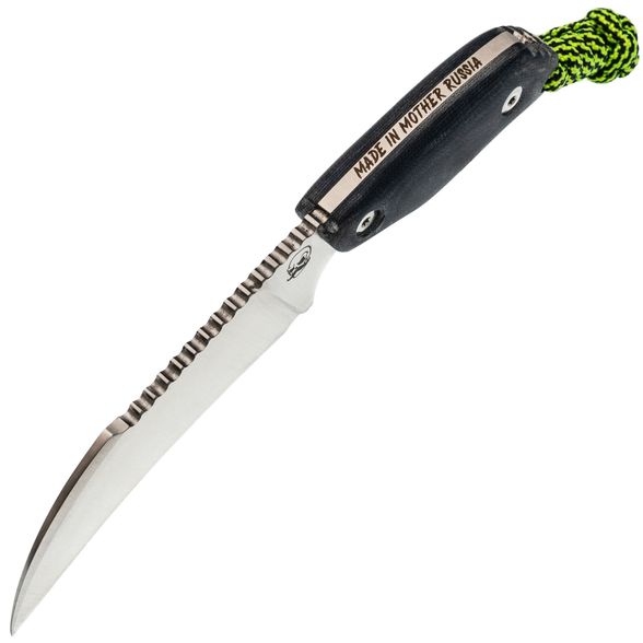 Рукоять на 3-3.5 пальца выполнена с акцентом на форму и объём, что делает её удобной даже при ограниченной длине. Для надёжного удержания в разных хватах предусмотрены насечки на рукояти и обухе клинка. Дополнительный контроль даёт темляк, входящий в комплект, позволяющий обеспечить полный хват при необходимости.