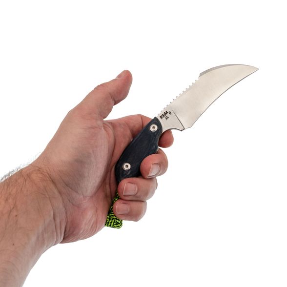 Naga II XL Серп - это фиксированный нож, созданный с прицелом на повседневные задачи. Несмотря на скромную длину, модель обладает крупным клинком, что стало возможным благодаря компактной, но проработанной рукояти на несколько пальцев. Такой баланс делает нож удобным в ношении и при этом функциональным в использовании, особенно в условиях ограниченного пространства или активного движения.