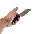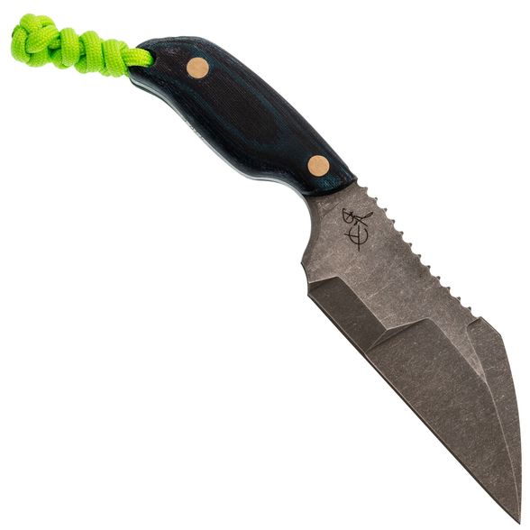 Несмотря на компактность, рукоять объёмная и удобно лежит в руке, особенно с учётом насечек и продуманного рельефа. Хват рассчитан на 3-3.5 пальца, но в комплекте предусмотрен темляк, который позволяет надёжно зафиксировать нож в руке. Эргономика рукояти и обуха клинка делает нож удобным для разных хватов - от силового до точного.