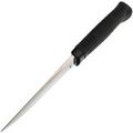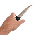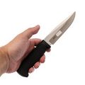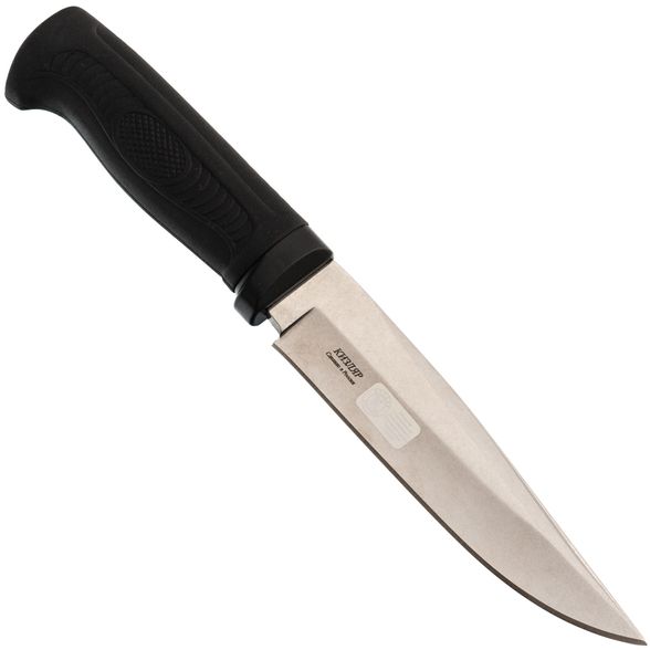 Рукоять изготовлена из современного материала эластрона, который обеспечивает высокую прочность и эластичность. Благодаря этому нож удобно и надежно лежит в руке, не скользя даже в мокром состоянии. Дополнительный металлический упор предотвращает соскальзывание руки на режущую кромку, обеспечивая безопасность при использовании.
