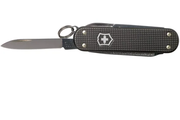 Рукоять с накладками Alox делает нож плоским и удобным для ношения, не утолщая связку ключей и не выпирая в кармане. Тиснёная текстура обеспечивает уверенный хват даже влажными пальцами, а скошенные грани не цепляют ткань. Серый цвет лимитированной серии подчёркивает сдержанный стиль и универсальность: такой нож одинаково органично смотрится и рядом с деловыми ключами, и в наборе EDC-аксессуаров. Логотип Victorinox на одной из сторон завершает образ классики, узнаваемой с первого взгляда.